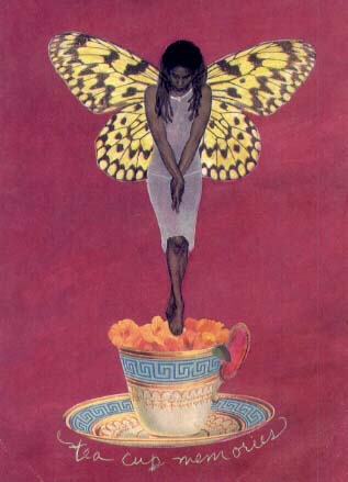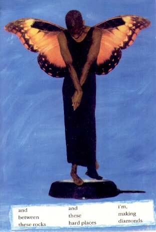 Clymenza Hawkins works primarily in the mediums of water color and paper, the figures she creates draws the viewer into a surreal, mythical world. Her techniques of collage and photomontage catapulted her into a series of works on paper The Chrysalis Collection, featuring photomontage images of women of color with butterfly wings. |